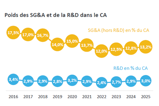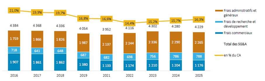 En CSEC (Comité Social Economique Central), le cabinet Secafi qui éclaire les organisations syndicales sur la politique économique et financière de l’entreprise a présenté son rapport sur les résultats de l’année 2025. Parmi les points abordés, un focus a été apporté sur les SG&A (acronyme anglais pour : Selling, General & Administrative expenses). Pour rappel, les SG&A regroupent trois grands postes de dépenses : Les frais administratifs et généraux (2 265 M€) Les frais de recherche et développement (788 M€) Les frais commerciaux (1 176 M€) En 2025, les SG&A ont légèrement reculé en valeur et restent à un niveau contenu en % du chiffre d’affaires.